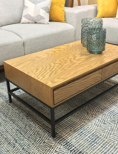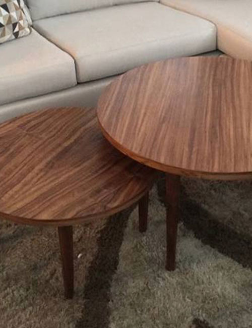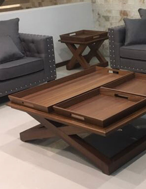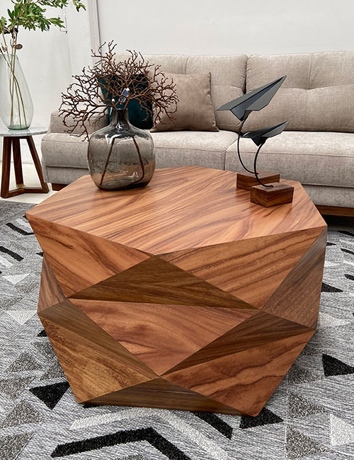 Mesa central fabricada con patas de parota sólida y cubierta de chapa de parota