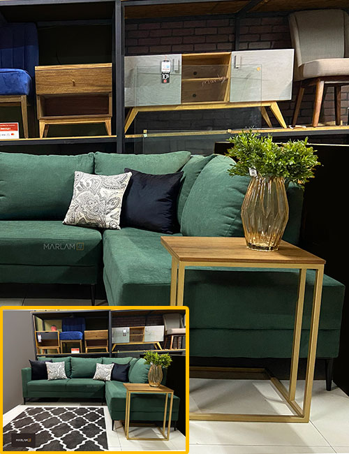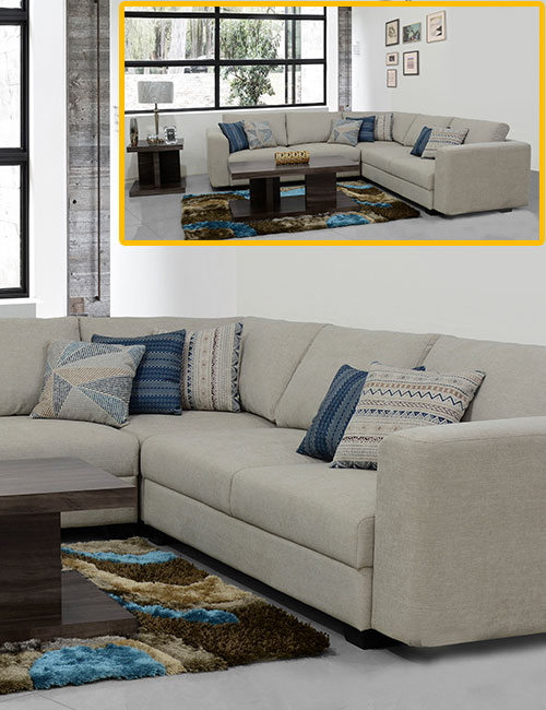 Sala en esquina, fabricada con una estructura de madera sólida de pino y patas-soclo de madera sólida de parota o rosa morada.